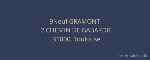 Vous pouvez renseigner les horaires 9Neuf GRAMONT situé à Toulouse, vous pouvez trouver les informations de contact, comme sa localisation à 2 CHEMIN DE GABARDIE, ainsi que les coordonnées GPS, lattitude : 43.6318203 et longitude : 1.4847311. Chaussures, Vêtements enfants, Vêtements femme et Vêtements homme voici les 4 principales activités de 9Neuf GRAMONT