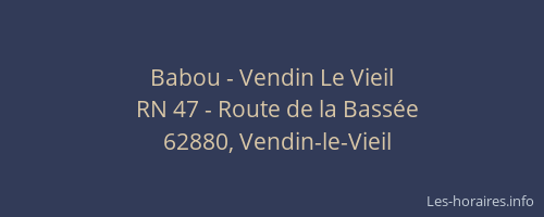 Voici les horaires de Babou - Vendin Le Vieil situé à Vendin-le-Vieil,
