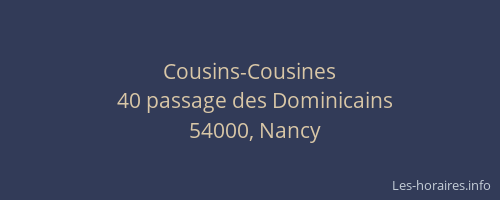 Voici les horaires de Cousins-Cousines situé à Nancy,