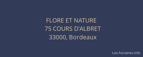 Vous pouvez renseigner les horaires FLORE ET NATURE situé à Bordeaux,