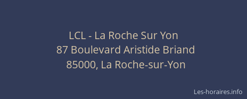 Voici les horaires de LCL - La Roche Sur Yon situé à La Roche-sur-Yon,