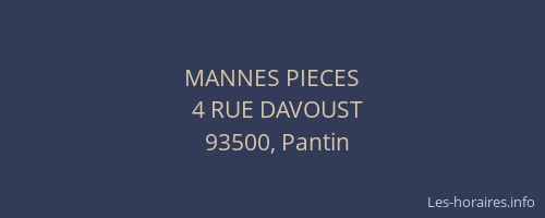 Voici les horaires de MANNES PIECES situé à Pantin,