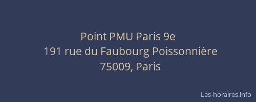 Pour connaître les horaires de Point PMU 9e n'hésitez pas à téléphoner à ce numéro : 01 48 78 19 27