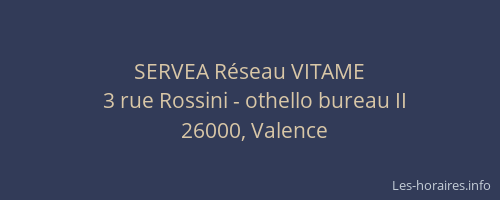Voici les horaires de SERVEA Réseau VITAME situé à Valence,