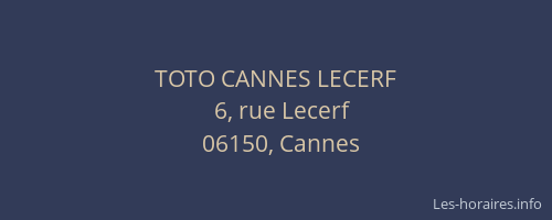 Voici les horaires de TOTO CANNES LECERF situé à Cannes,