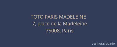 Voici les horaires de TOTO PARIS MADELEINE situé à Paris,