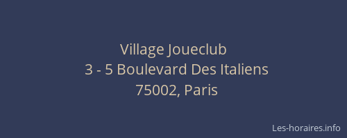Voici les horaires de Village Joueclub situé à Paris 2ème,