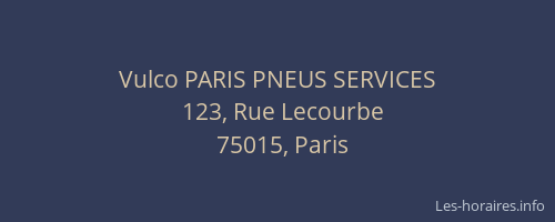 Voici les horaires de Vulco PARIS PNEUS SERVICES situé à Paris,