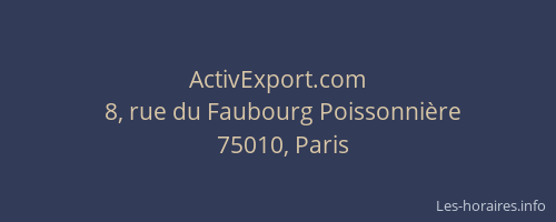 Voici les horaires de ActivExport.com situé à Paris 10ème,