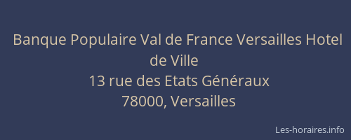 Voici les horaires de Banque Populaire Val de France Hotel de Ville situé à Versailles,