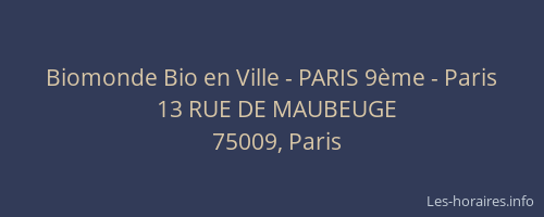 Voici les horaires de Biomonde Bio en Ville - PARIS 9ème - situé à Paris 9ème,