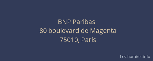 Vous pouvez renseigner les horaires BNP Paribas situé à Paris 10ème, vous pouvez trouver les informations de contact, comme sa localisation à 80 boulevard de Magenta, ainsi que les coordonnées GPS, lattitude : 48.8760615 et longitude : 2.3566927. Assurances et Banque voici les 2 principales activités de BNP Paribas