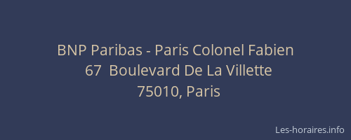 Voici les horaires de BNP Paribas - Colonel Fabien situé à Paris,