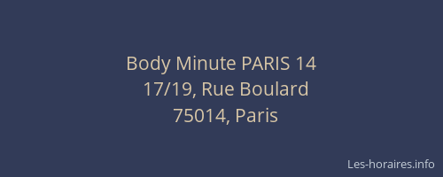 Voici les horaires de Body Minute PARIS 14 situé à Paris,