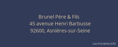 Voici les horaires de Brunel Père & Fils situé à Asnières-sur-Seine,