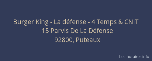 Voici les horaires de Burger King - La défense - 4 Temps & CNIT situé à Puteaux,