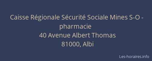 Voici les horaires de Caisse Régionale Sécurité Sociale Mines S-O - pharmacie situé à Albi,