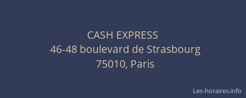 Voici les horaires de CASH EXPRESS situé à Paris 10ème,