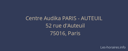 Voici les horaires de Centre Audika PARIS - AUTEUIL situé à Paris,