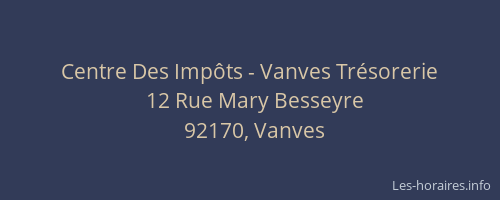 Voici les horaires de Centre Des Impôts - Trésorerie situé à Vanves,