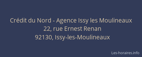Voici les horaires de Crédit du Nord - Agence Issy les Moulineaux situé à Issy-les-Moulineaux,