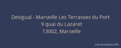 Voici les horaires de Desigual - Les Terrasses du Port situé à Marseille,
