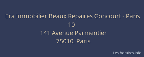 Voici les horaires de Era Immobilier Beaux Repaires Goncourt - 10 situé à Paris,