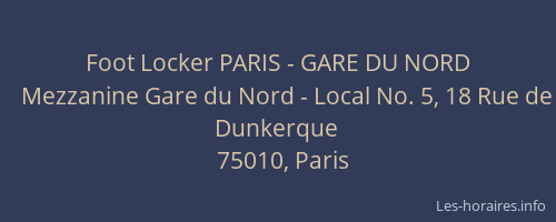 Voici les horaires de Foot Locker PARIS - GARE DU NORD situé à Paris,