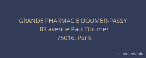 Voici les horaires de GRANDE PHARMACIE DOUMER-PASSY situé à Paris 16ème,