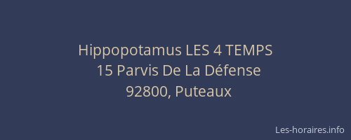 Voici les horaires de Hippopotamus LES 4 TEMPS situé à Puteaux,