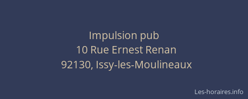 Voici les horaires de Impulsion pub situé à Issy-les-Moulineaux,