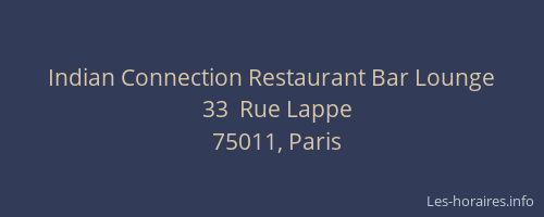 Voici les horaires de Indian Connection Restaurant Bar Lounge situé à Paris 11ème,