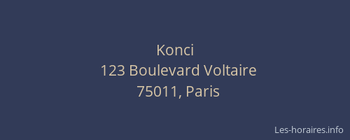 Vous pouvez renseigner les horaires Konci situé à Paris 11ème, vous pouvez trouver les informations de contact, comme sa localisation à 123 Boulevard Voltaire, ainsi que les coordonnées GPS, lattitude : 48.8569728 et longitude : 2.382086. Cinéma, Jeux, Livres, Mixtes et Musique voici les 5 principales activités de Konci