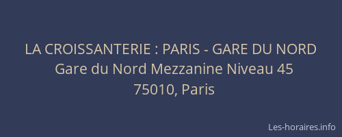 Voici les horaires de LA CROISSANTERIE : PARIS - GARE DU NORD situé à Paris,