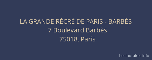 Voici les horaires de LA GRANDE RÉCRÉ DE PARIS - BARBÈS situé à Paris,