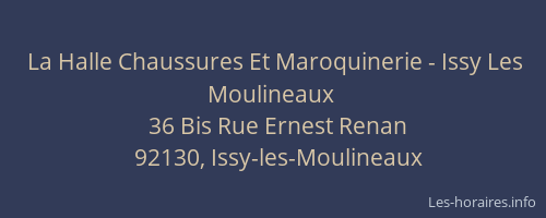 Voici les horaires de La Halle Chaussures Et Maroquinerie - Issy Les Moulineaux situé à Issy-les-Moulineaux,