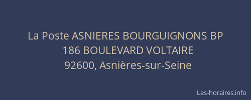Voici les horaires de La Poste ASNIERES BOURGUIGNONS BP situé à Asnières-sur-Seine,