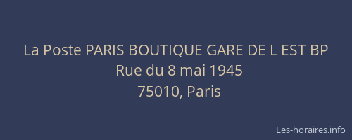 Voici les horaires de La Poste PARIS BOUTIQUE GARE DE L EST BP situé à Paris,