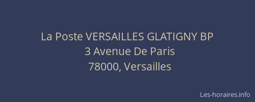 Voici les horaires de La Poste VERSAILLES GLATIGNY BP situé à Versailles,