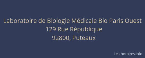 Voici les horaires de Laboratoire de Biologie Médicale Bio Paris Ouest situé à Puteaux,