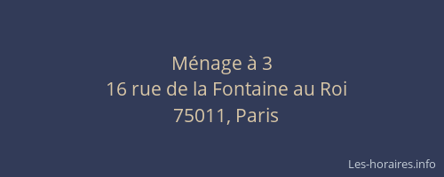 Voici les horaires de Ménage à 3 situé à Paris 11ème,