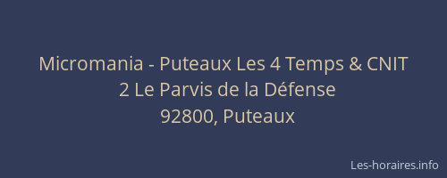 Voici les horaires de Micromania - Les 4 Temps & CNIT situé à Puteaux,