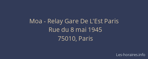 Voici les horaires de Moa - Relay Gare De L'Est situé à Paris 10ème,