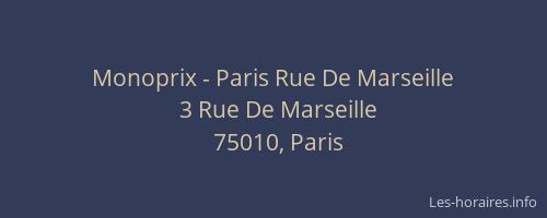 Voici les horaires de Monoprix - Rue De Marseille situé à Paris 10ème,
