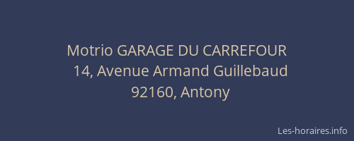 Vous pouvez renseigner les horaires Motrio GARAGE DU CARREFOUR situé à Antony,
