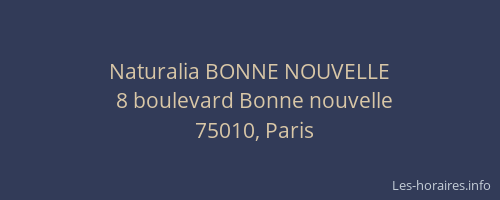 Voici les horaires de Naturalia BONNE NOUVELLE situé à Paris 10ème,