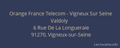 Voici les horaires de Orange France Telecom - Vigneux Sur Seine Valdoly situé à Vigneux-sur-Seine,