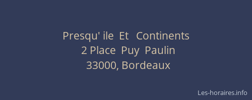 Voici les horaires de Presqu' ile Et Continents situé à Bordeaux,