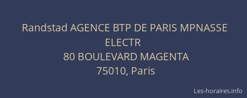 Voici les horaires de Randstad AGENCE BTP DE PARIS MPNASSE ELECTR situé à Paris,