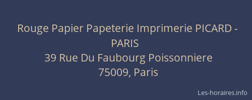 Voici les horaires de Rouge Papier Papeterie Imprimerie PICARD - PARIS situé à Paris 9ème,